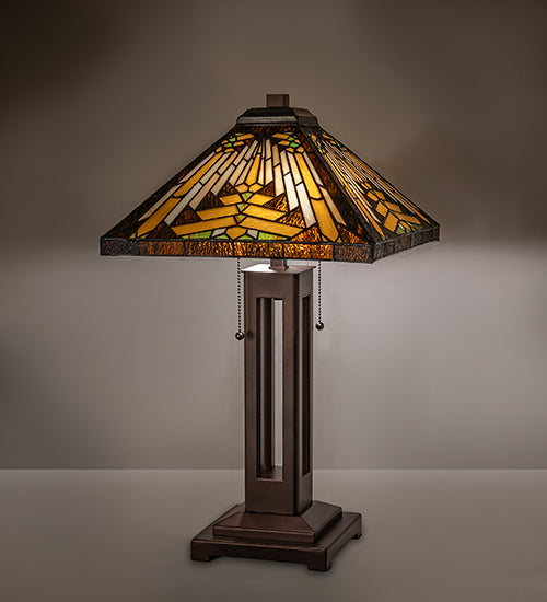 Like gazing out your window across the warm desert at sunset, interlocking tiles of Sand tone Beige glow behind the sun, glistening Orange, Amber Green, and Brown rays. A Root Brown border surrounds all this. The stunning Nuevo Mission table lamp features a stained glass shade created using the famous Meyda Tiffany copperfoil construction method and embraced with a Mahogany Bronze finished lamp base offered in a handsome Mission style. The Nuevo Mission Table Lamp is featured in our American-designed, handmade Southwestern Stained Glass Series. Each shade is a unique work of art with color variations based on natural ingredients inherent in the glass.