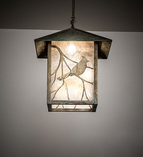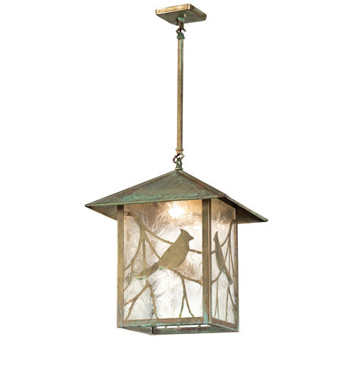You can almost hear this singing bird's beautiful melodies that echo the rhythms of Mother Nature. Delicately etched of Solid Brass, exquisite silhouettes of a Song Bird perched on branches accent this charming lantern style fixture. The ceiling pendant is finished in Verdigris and features a Clear Leaf Art Glass diffuser. The Seneca Song Bird Pendant is included in our American-made, American-designed, handcrafted Craftsman Signature Series and manufactured in Yorkville, New York. Custom options are available. If you intend to utilize this product in a coastal or any other challenging wet location, please call us for a quote.