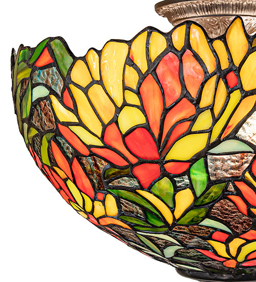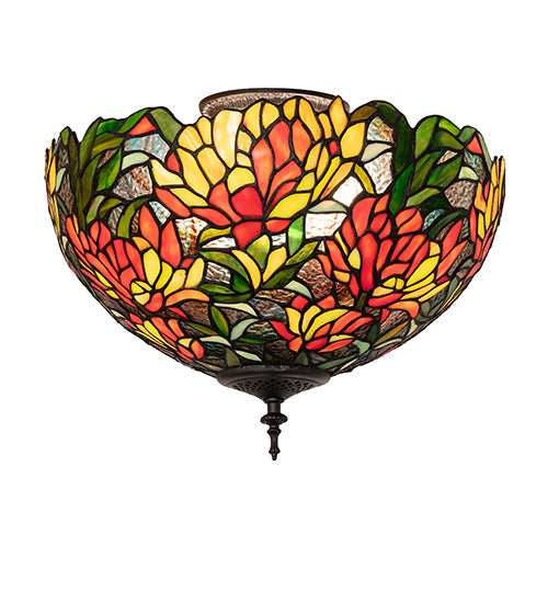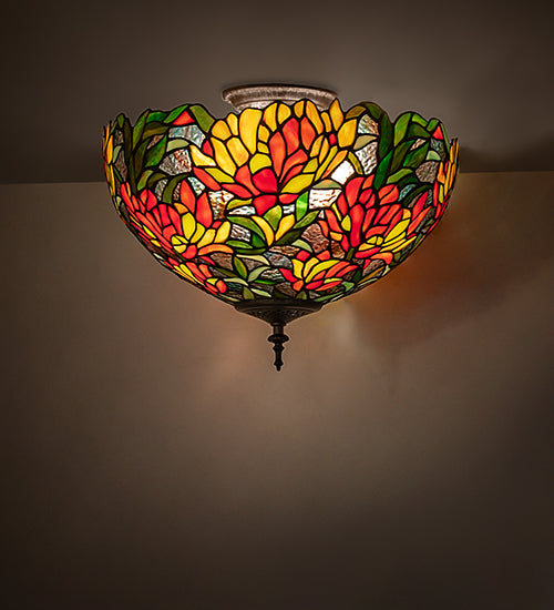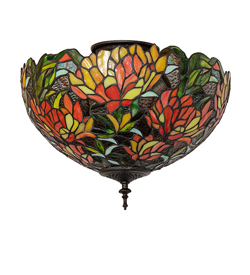 In all its natural beauty, a bouquet of blossoming flowers in Peach, Tangerine and Yellow hues bloom while surrounded by radiant Willow Green leaves and glistening Multicolored Rippled glass. This flushmount is so beautiful that you will think you are sitting in an English Garden. This stunning Tiffany styled stained glass shade, with coordinating hardware in a warm Mahogany Bronze finish, will add a brilliant, luxurious elegance to your home. If you intend to utilize this product in a coastal or any other challenging damp location, please call us for a quote.