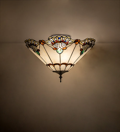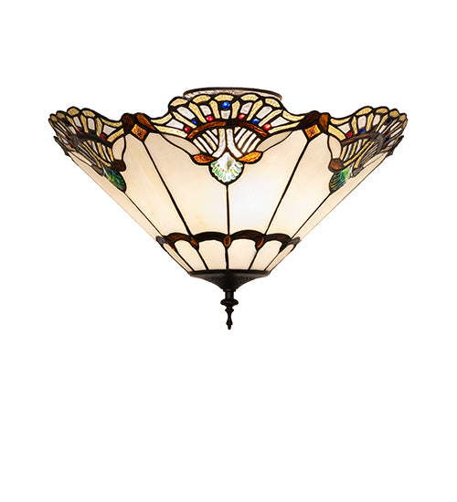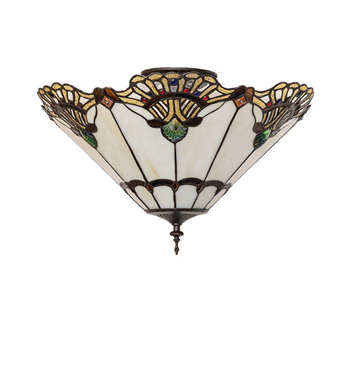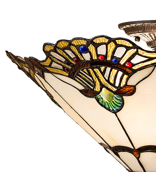 Oceanic Iridescent Blue/Green Jeweled nautical shells, surrounded by Blue and Red jewels, highlight an intricate Art Nouveau motif in Amber and Clear Ripple glass, accented with iridescent Amber formed jewels on Bone Beige. A Multicolored ringlet motif featured on the bottom is accented with Amber oval jewels, while Amber diamond-shaped jewels accent the top. This inverted shade is handcrafted using the famous Meyda Tiffany copper foil construction process and complemented with an Oil Rubbed Bronze finish. The Shell with Jewels Flush Mount is included in our American-designed, handcrafted Stained Glass Lighting Collection. Each shade is a unique work of art with color variations based on natural ingredients inherent in the glass. If you intend to utilize this product in a coastal or any other challenging damp location, please call us for a quote.