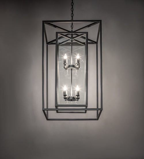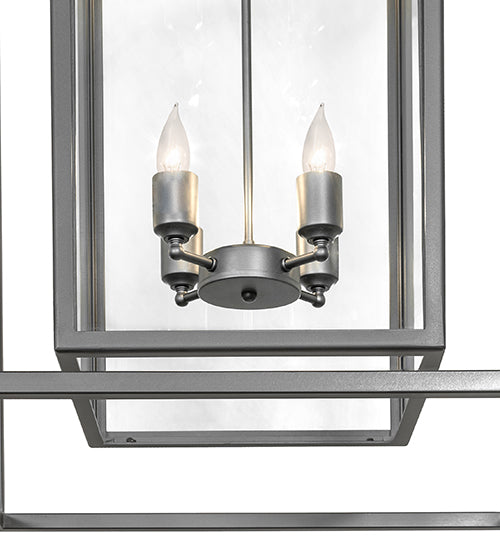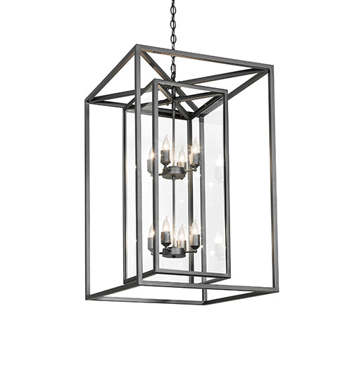 A sophisticated, architecturally styled fixture is designed with a unique, fresh, and stylish pizazz. Give your decor an extra edge with this breathtaking fixture highlighted with a solid structure. Beautiful ambient illumination is delivered by eight complementary faux candlelights, which can be seen through a Clear Glass lens. The hardware and frame are featured in a handsome Wrought Iron finish. The pendant is ideal for placement in foyers, ballrooms, and lobbies in residential, hospitality, and commercial spaces. The overall height ranges from 44 to 115 inches, as the chain can be easily adjusted on location, depending on customer requirements. The Kitzi Box Pendant is included in our American-made, American-designed, handcrafted Transitional Lighting Collection and manufactured in Yorkville, New York. Custom options are available. If you intend to utilize this product in a coastal or any other challenging damp location, please call us for a quote.