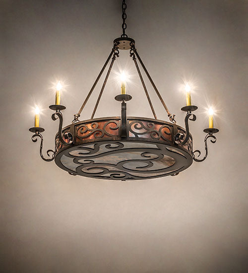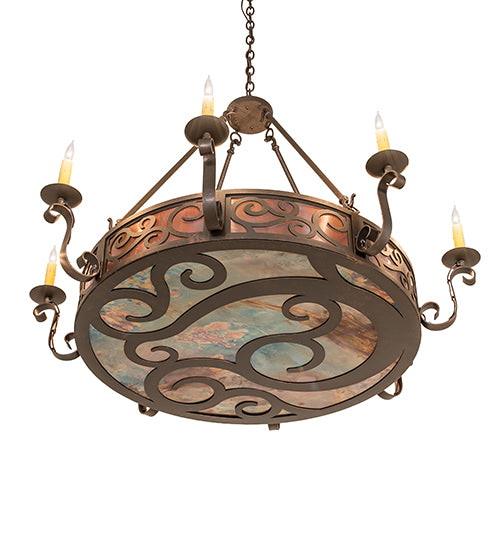 A touch of warm opulence is blended with elegant scroll-like styling. This lovely chandelier is handcrafted with decorative accents and hardware in a stunning Gilded Tobacco finish, which is enhanced with sparkling illumination emanating from eight Ivory faux candlelights perched on bobeches. The overall height of this pendant can be adjusted upon installation with a chain length that ranges from 36 to 83 inches to meet your specific lighting application needs. Ideal for homes and restaurants from Memphis, Tennessee, to Detroit, Michigan, to Honolulu, Hawaii. The Delano Chandelier is featured in our American-made, American-designed, handcrafted Transitional Collection, which is manufactured in Yorkville, New York. Custom options are available. If you intend to utilize this product in a coastal or any other challenging damp location, please call us for a quote.