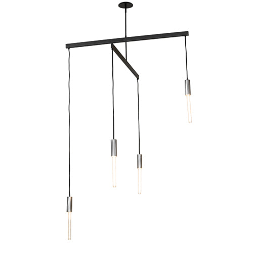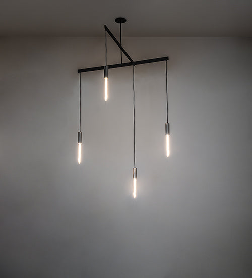 Pronograde is an architectural structure that features a crossbar configuration with four arms, each embracing filament-style lamps for a unique decorative look. The frame and hardware are finished in Flat Black, while the lamp fitters are featured in Brushed Stainless Steel. This lighting design is perfect for entryways and larger spaces in modern homes, offices, and labs. The Pronograde Chandelier is featured in our American-made, American-designed, handcrafted Industrial Lighting Collection. This fixture was designed by David Singer of Arc Light Design in New York and is featured at a private residence in Texas. Custom options are available. If you intend to utilize this product in a coastal or any other challenging damp location, please call us for a quote.