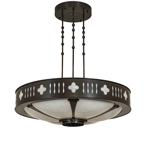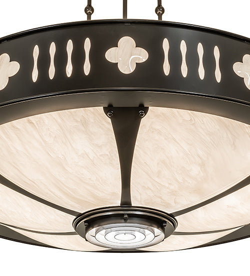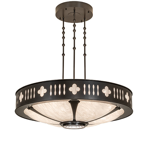 Gothic charm with a modern flair. This ceiling pendant features rounded cross-stylized motifs with decorative accents around the perimeter surrounding the elegant Angelwing Idalight bowl-shaped diffuser. Timeless Bronze finish. The lighting fixture illuminates with eight inner lights to bring out the beauty of the Idalight and one downlight to deliver task lighting on surfaces below. An ideal centerpiece for living spaces or dining areas in residential and hospitality settings, from Bar Harbor, Maine, to Holland, Michigan, to Venice, California. The Portaferry Pendant is included in our American-made, American-designed, handcrafted Contemporary Lighting Collection and manufactured in Yorkville, NY. Custom options are available. If you intend to utilize this product in a coastal or any other challenging damp location, please call us for a quote.