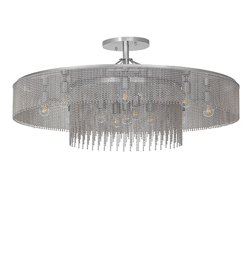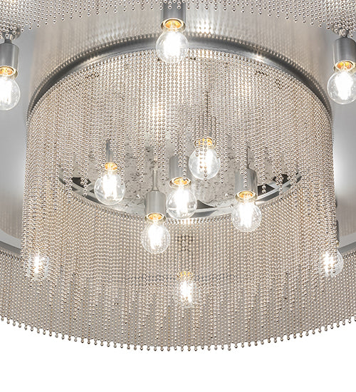 Like a hard rain beginning to fall, this dynamic chandelier illuminates beautifully, replicating a brilliant sun shower with a modern industrial twist. The 13 Edison-style lamps illuminate inner and outer garlands of Extreme Chrome and Faux Mercury finished metal balls and chains. This ceiling fixture serves as a centerpiece for dining and living areas in residential, retail, office, and hospitality spaces. The Ball Chain Chandelier is featured in our American-made, American-designed, handcrafted Industrial Lighting Collection. This fixture is manufactured in Yorkville, New York. he fixture was specified by Kimberly Timmons Interiors of Denver, Colorado, for a residence in Cherry Hills Village, Colorado. Custom options are available. If you intend to utilize this product in a coastal or any other challenging damp location, please call us for a quote.