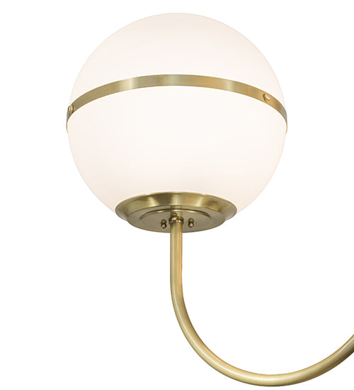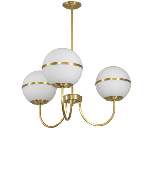 This chandelier features three Matte White Glass shades accented with horizontal bands and decorative studs in Brushed Brass. Ideal for entryways, dining areas, and other residential, hospitality, and commercial spaces. Included in our American-designed, handcrafted Modern Lighting Collection. Manufactured in YorkvilIe, New York. If you intend to utilize this product in a coastal or any other challenging damp location, please call us for a quote. Featured at the Boston Symphony Orchestra. Custom options are available.