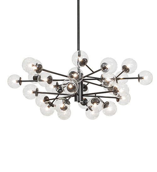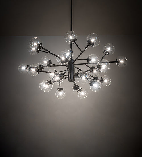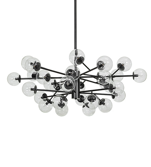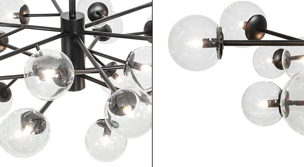 A cool contemporary look. 30 Clear Glass orbs extend outward for a striking ethereal effect. All decorative spherical elements are enhanced with a frame featured in a Matte Black finish. Edison-style lamps illuminate from within each Bola orb for beautiful ambient illumination. Ideal for lighting lobbies, entryways, and other large spaces in residential, hospitality, and commercial settings. The Bola Matrix Chandelier is included in our American-designed, handmade Contemporary Lighting Collection. Custom options are available. If you intend to utilize this product in a coastal or any other challenging damp location, please call us for a quote.