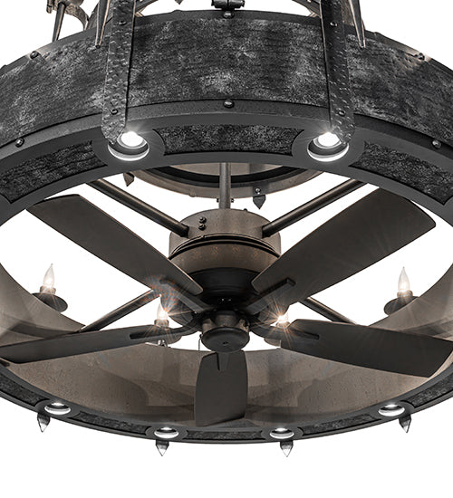 This award-winning Chandel-Air has two-tiers featuring a lower tier that doubles as a decorative casement for a ceiling fan. Both tiers are embellished with a steel band featured in a Old Wrought Iron & Gunmetal. 18 faux Amber candelights perched on bobeches provide ambient lighting while 12 medium base downlights deliver functional illumination. Individually handcrafted in Yorkville, New York by highly skilled Meyda artisans, this Chandel-Air is designed as an energy saver pulling hot air up and keeping the space cool in the summer. The fan is reversed in the winter to push down hot air and maintain warmth. Custom options are available. If you intend to utilize this product in a coastal or any other challenging damp location, please call us for a quote
