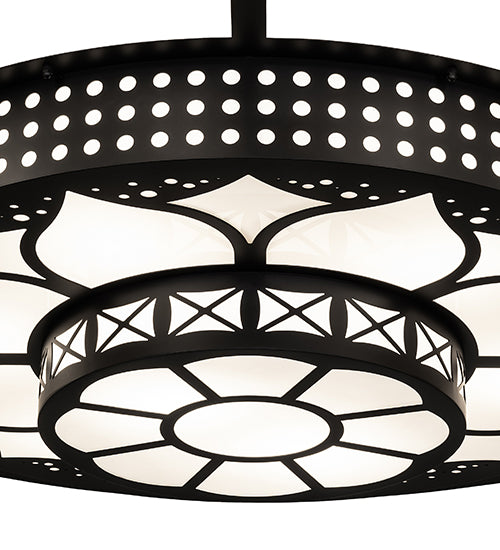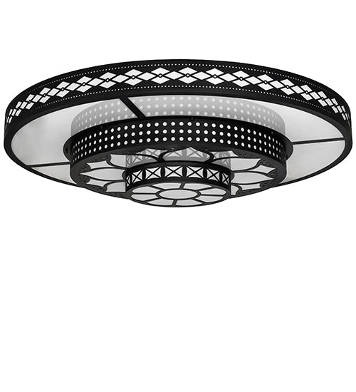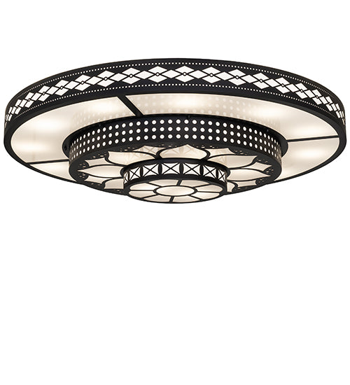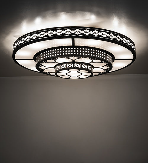 Like an enchanting flower budding with petals, this stunning design-layered fixture appears to bloom with beautiful light. Three tiers of intriguing designs are highlighted with Statuario Idalight bottom diffusers, which combine a broad range of geometric motifs with a floral style and are enhanced with a bold Solar Black finish. This massive ceiling fixture can be placed in entryways and large spaces in fine homes, casinos, restaurants, and hotels. The Binion Flush Mount is featured in our American-made, American-designed, handcrafted Deco Lighting Collection and is manufactured in Yorkville, New York. This fixture is featured in the Horseshoe Tunica Casino in Robinsville, Mississippi. Custom options are available. If you intend to utilize this product in a coastal or any other challenging damp location, please call us for a quote.