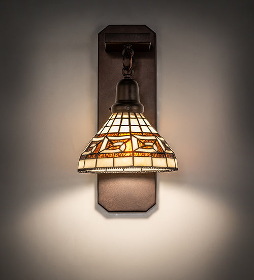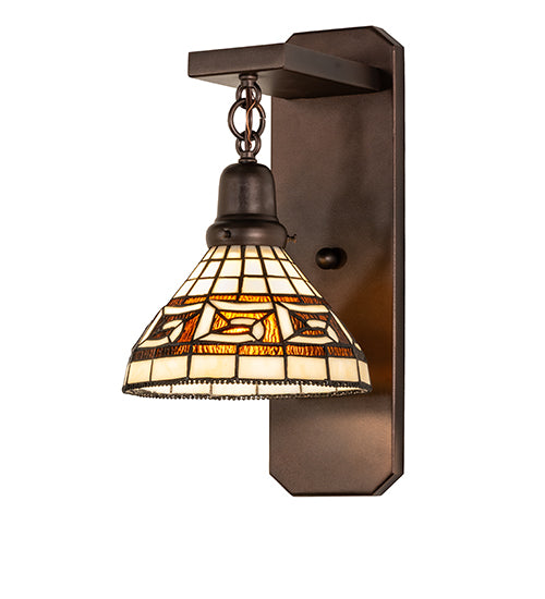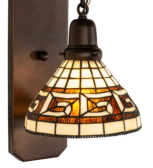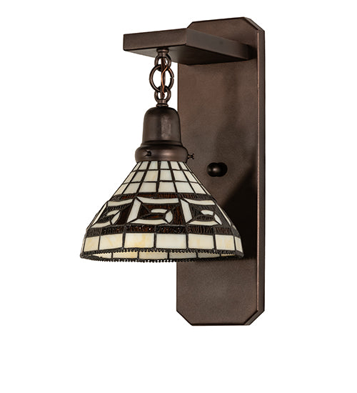 Like one of the many geometric patterns employed by Tiffany Studios, our classic Greek key pattern is executed in a granite-textured Olive Brown on a Parthenon Beige grid. Bordered in metal bead trim and finished in Mahogany Bronze, this stained glass wall sconce makes a dramatic statement in hallways and dining areas in your home. The Greek Key Wall Sconce is featured in our handcrafted Stained Glass Lighting Collection. Our offshore factory partner manufactures the shade, and the hardware and assembly are made in Yorkville, New York. Each shade is a unique work of art with color variations based on natural ingredients inherent in the glass. Custom options are available. If you intend to utilize this product in a coastal or any other challenging damp location, please call us for a quote.