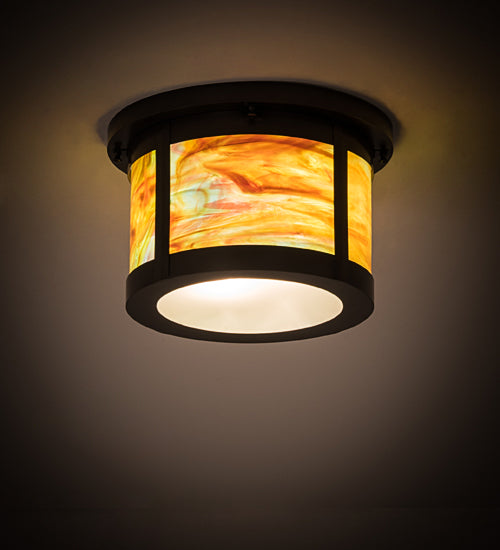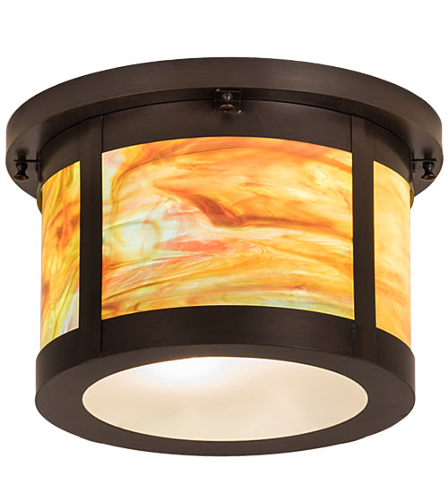 Custom crafted of Solid Brass. This handsome flushmount ceiling fixture is evocative of the American Craftsman Design Movement. This cylindrical fixture will add warmth and authentic appeal to interior spaces while creating a visually pleasing experience with beautiful ambient light. The stunning shade combines Jade, Rust and Blue Opal Glass with a Frosted Clear bottom diffuser. The fixture is enhanced with a Craftsman Brown finish. Domestically produced in our 180,000 sq ft manufacturing facility in Yorkville, N.Y. Customize diffuser colors, metal finishes and sizes to your taste. If you intend to utilize this product in a coastal or any other challenging damp location, please call us for a quote.