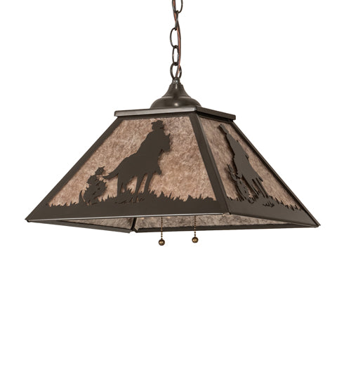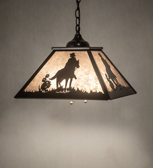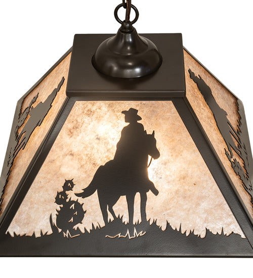 Bring the western charm of the prairie inside your home. A Cowboy riding his trusty horse near a large cactus plant accents this Western inspired ceiling pendant. The fixture features a Silver Mica shade which is complemented with a Timeless Bronze finish. Overall height ranges from 15 to 44 inches at the chain can be easily adjusted in the field. The Cowboy Pendant is included in our American made, American designed, handcrafted Western Lighting Collection. Custom colors, styles, and sizes are available. If you intend to utilize this product in a coastal or any other challenging damp location, please call us for a quote.