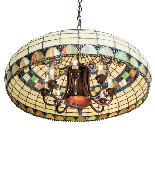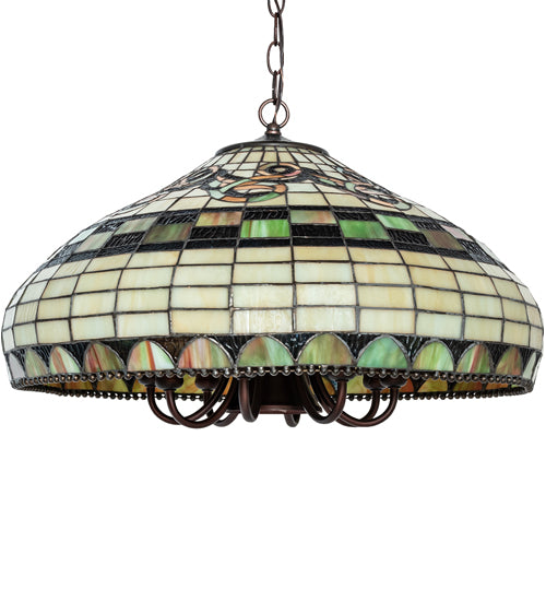 Graceful scrolls, bands and arches of Cerise streaked Moss Green art glass are accented with muted Aubergine rippled glass on a Bone Beige grid in this Tiffany Edwardian styled shade. A metal bead circles the stained glass shade, which is created using Meyda Tiffany's famous copper foil construction. Ideal for pairing with a base to create a table or floor lamp, or building a ceiling or wall fixture with hardware. The pendant is paired with a premium light cluster that includes a downlight to brighten a table and eight candelabras for even illumination of the stained glass. We recommend pairing this fixture with a wall dimmer for optimal performance in your space. The Tiffany Edwardian Pendant is included in our American-designed, handcrafted Tiffany Reproduction Lighting Collection. Each shade is a unique work of art with color variations based on natural ingredients inherent in the glass. If you intend to utilize this product in a coastal or any other challenging damp location, please call us for a quote.