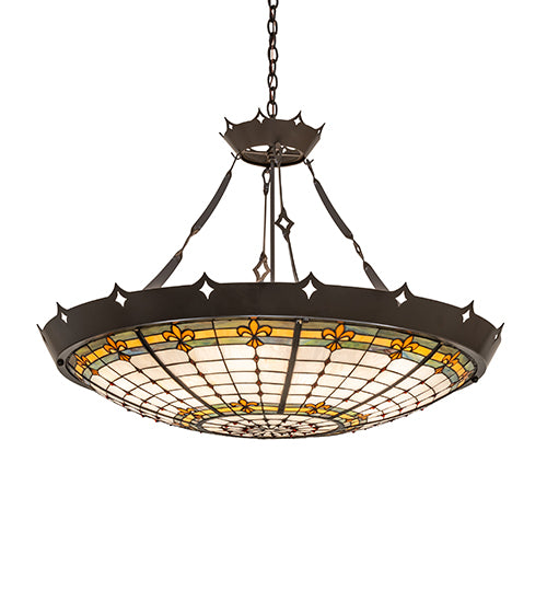An original Meyda Tiffany design. This curvaceous Fleur-de-Lite inverted shade is an elegant design featuring Golden stylized three-petaled irises with Amber colored jewels. A multi-colored Blue, Purple, and Green band is featured on a Beige background. A stately Medieval handcrafted frame cradles the stained glass shade, which is reminiscent of castle and cathedral stained glass. The Timeless Bronze-finished metal band crowns the frame and enhances the hardware. This stunning ceiling pendant can illuminate entryways and dining spaces in fine homes and restaurants from Saratoga Springs, New York, to Fishers, Indiana, to Redmond, Washington. The overall height ranges from 31 to 63 inches, as the chain length can be easily adjusted in the field to accommodate your specific lighting application needs. The Fleur-de-Lite Pendant is included in our American-designed, handcrafted Stained Glass Lighting Collection. Each shade is a unique work of art with color variations based on natural ingredients inherent in the glass. If you intend to utilize this product in a coastal or any other challenging damp location, please call us for a quote.