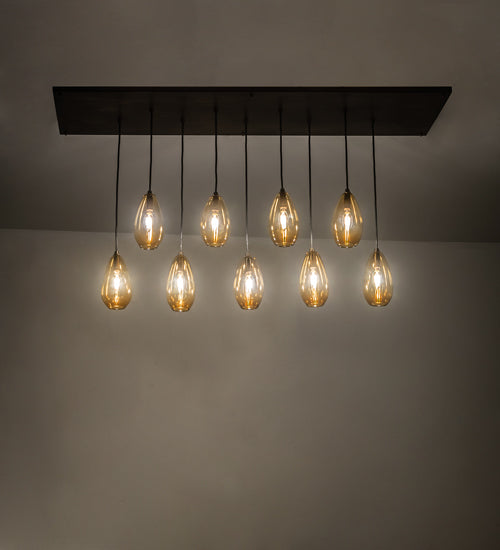 This exquisite Grand styled fixture features 9 Amber hand-blown glass shades, each featuring a curvaceous smooth profile that will entice. The shades are suspended with Black cords embraced by a large 54-inch rectangular canopy, featured in an Antique Copper finish. Raquel is ideal for illuminating dining tables, bars, conference tables and other residential, hospitality and commercial spaces. Handcrafted by highly skilled artisans in our manufacturing facility in Yorkville, NY, this fixture offers custom designs, sizes and colors, as well as dimmable energy efficient LED lamping options.