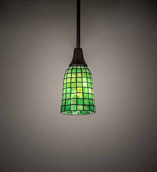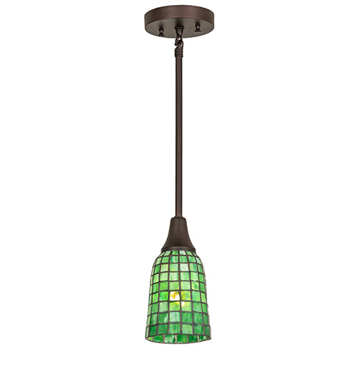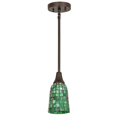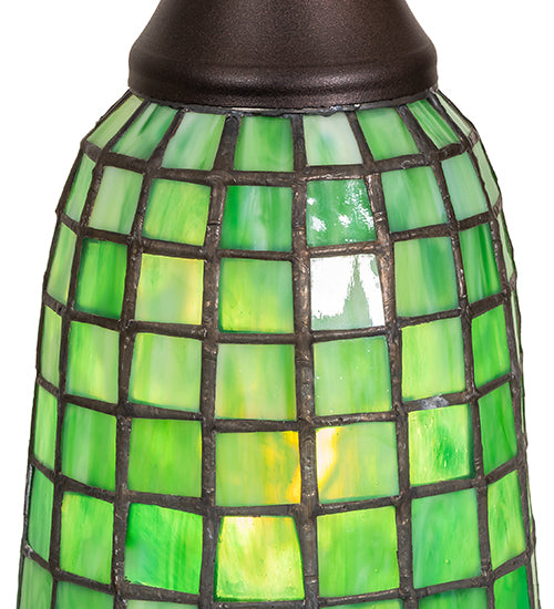 The stunning Terra Esmeralda Mini Pendant features brilliant Emerald Green glass that cascades in a Geometric grid on an elongated handcrafted shade. The art glass shade is created using the famous Meyda Tiffany copperfoil construction technique and is complemented with a warm Mahogany Bronze finish. You can install it in groups to make a design statement over islands, tables, counters, and bars. The Terra Esmeralda Mini Pendant is featured in our American-designed, handcrafted Stained Glass Lighting Collection. Each shade is a unique work of art, featuring color variations derived from the natural ingredients inherent in the glass. If you intend to utilize this product in a coastal or any other challenging damp location, please call us for a quote.