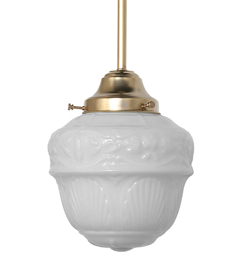 Restore the past with this always fashionable early electric reproduction Revival ceiling fixture. The gorgeous Rochelle-styled Globe pendant is constructed with a floral and scalloped patterned White Opal Schoolhouse Glass shade and enhanced with Brass hardware. This vintage lighting fixture features a refined yet consistent distinctive style that originated back in traditional schoolhouses and public buildings in the early 1920s. Inspired by schoolhouses from Wells, Maine and Columbia County, New York, to Waverly and Canaan, Pennsylvania and Mason County, West Virginia, to Cedar Falls, Iowa and Lawson, Missouri. The Revival Schoolhouse Pendant is included in our American-designed, handcrafted Schoolhouse Lighting Collection.