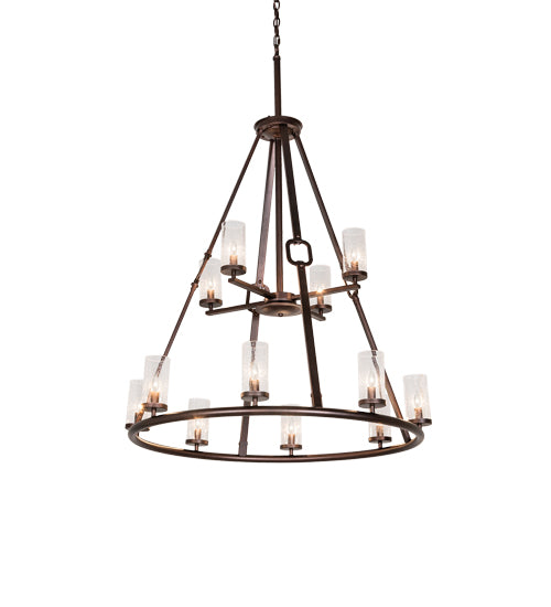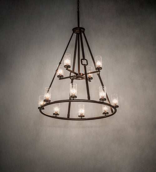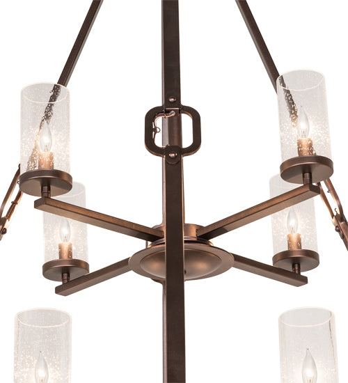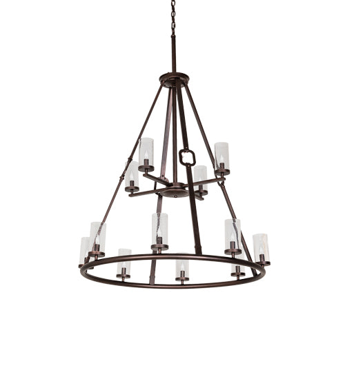 Blending an elegant style with a classic, distinguished look. Loxley Hugo is custom-crafted with 12 Clear Seeded Glass Cylindres on a sturdy ring featured in a Mahogany Bronze finish. The striking chandelier is ideal for illuminating entryways, ballrooms, and lobbies. Inspired by chandeliers in homes from Hilton Head Island, South Carolina, to West Palm Beach, Florida, to Dallas, Texas. The overall height ranges from 58 to 95 inches, as the chain can be easily adjusted in the field to meet your precise requirements. The Loxley Chandelier is included in our American-made, American-designed, handcrafted Transitional Lighting Collection and manufactured in Yorkville, New York. Custom options are available. If you intend to utilize this product in a coastal or any other challenging damp location, please call us for a quote.