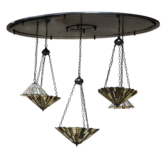 Thinly hand carved and polished natural Jadestone highlight these five brilliant tile pattered shades in earthy tones of Moss Green, Tan, Natural Ivory and Coral. The natural stone shades are crafted with Meydas famous copperfoil construction process used to build Tiffanies. The shades are connected to a large medallion shaped canopy with hardware is featured in a Cosmic Silver Vein finish. Custom designs, sizes and colors are offered.
