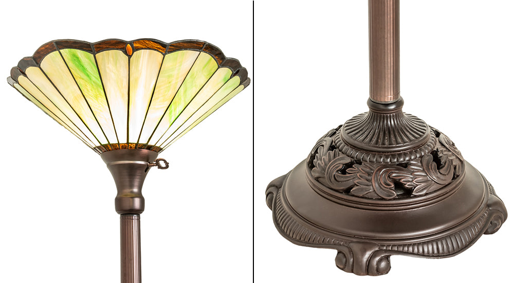 A classic stained glass design to complement any decorative scheme, from traditional and contemporary, to eclectic or nostalgic. This stunning Caprice Floor Lamp features an appealing Avocado Green stained glass shade with Bark Brown trim. The inverted shade is created using the famous Meyda Tiffany copperfoil construction process. The hardware is finished in a handsome Mahogany Bronze. The Caprice Floor Lamp is included in our American-designed, handcrafted Tiffany Stained Glass Collection. Each shade is a unique work of art with color variations based on natural ingredients inherent in the glass.
