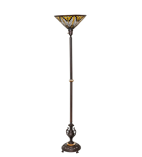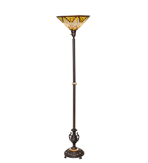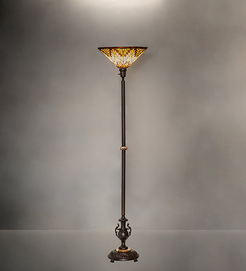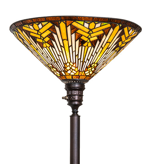 Like gazing out your window across the warm desert at sunset, interlocking tiles of Sandstone Beige glow behind the sun, glistening with Orange, Amber, Green, and Brown rays. A Root Brown border surrounds all this intricate design. The inverted stained- glass shade is crafted using the famous Meyda Tiffany copper foil construction technique and paired with an elegant metal floor base finished in Mahogany Bronze, and adorned with Onyx accents. Place this torchiere behind a sectional couch or easy chair in residential, commercial, and hospitality spaces to create a dramatic design statement. The Nuevo Mission Torchiere is included in our American- designed, handcrafted Stained Glass Lighting Collection. Each shade is a unique work of art with color variations based on natural ingredients inherent in the glass.