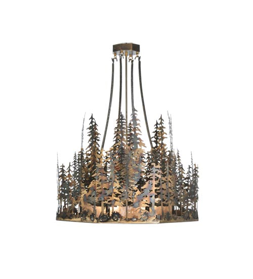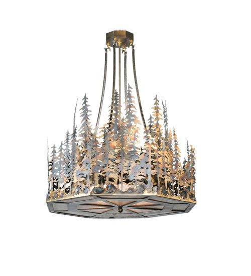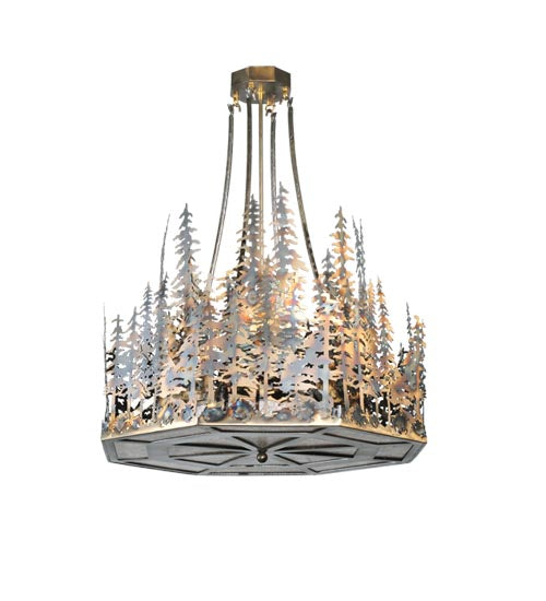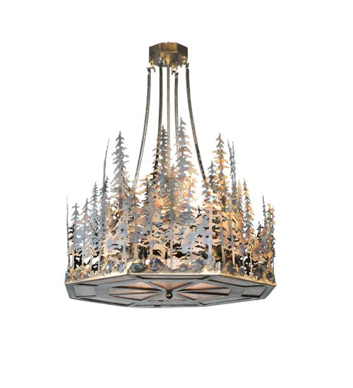 A stand of Tall pines beside a lake frame this linear octagonal shade handcrafted in the USA by Meyda artisans. Trees top the illuminated panels at the bottom of the pendant, hand finished in Burnished Copper with Silver Mica panels. May customize to your liking.