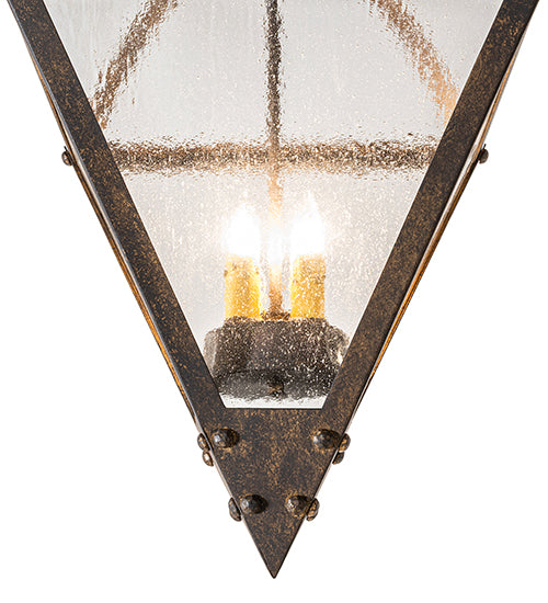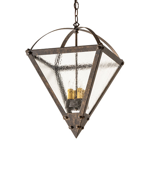 A sophisticated, inverted pyramid-styled fixture is designed with a unique, fresh, and stylish pizazz. Give your decor an edge with this breathtaking fixture, highlighted with a solid structure. Beautiful ambient illumination is delivered by four Ivory faux candlelights, which can be seen from within through a Clear Seeded Glass lens. The hardware and frame are featured in a handsome Petzite finish. It is ideal for placement in dining areas and entryways. The overall height ranges from 24 to 51 inches, as the chain can be easily adjusted on location depending on customer requirements. The Pyramid Inverted Pendant is included in our American-made, American-designed, handcrafted Transitional Lighting Collection, and it is manufactured in Yorkville, New York. Custom colors and sizes are available. If you intend to utilize this product in a coastal or any other challenging damp location, please call us for a quote.