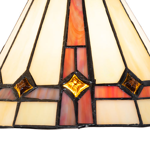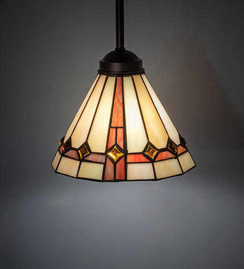 Exquisite Purple and Sunburst colored trim with Amber jewels adorn Beige Iridescent glass on this conical lamp shade. This stunning art glass shade is constructed with the famous Meyda Tiffany copperfoil construction process and is enhanced with a warm Mahogany Bronze finish. Inspired by stained glass lovers from Montgomery, Alabama, New Orleans, to Palm Beach, Florida. The overall height can be adjusted by combining the four stem lengths that are included: 6-inch, 12-inch, 16-inch, and 24-inch in any combination to achieve the desired drop from the ceiling. The Belvidere Mini Pendant is featured in our American-designed, handcrafted Stained Glass Lighting Collection. It can be installed in a row over an island, bar, counter, or table to make an impressive statement. The Belvidere Mini Pendant is included in our American-designed, handcrafted Stained Glass Lighting Collection. Each shade is a unique work of art with color variations based on natural ingredients inherent in the glass. Contact us if color matching is critical when ordering multiple items. If you intend to utilize this product in a coastal or any other challenging damp location, please call us for a quote.