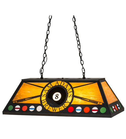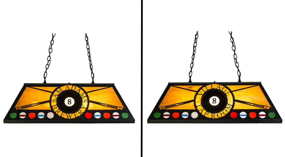 The Sam Adams Brewery name is featured in a Black metal overlay around a large 8-Ball design etched in Black and White, in the center of an Amber art glass shade. The shade is designed with crossing cue sticks which are designed with V and T on the butt ends to represent Village Taproom and intersect at the brand name. Colorful fused glass billiard balls outline the bottom of the shade on a matching Black border while the hardware is featured in a matching Black finish. Handcrafted by Meyda artisans in the USA, this oblong pendant is ideal for illuminating islands, counters, bars and billiard tables. Build a fixture with a name and brand personalized just for you or your business. Custom sizes, colors and styles are available.