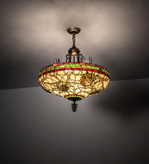 This stunning design features the iconic pinecone, one of Mother Nature's most compelling organic symbols, which offers a natural elegance and represents the evolution of human enlightenment. Burgundy and Leaf Green bands edge this woodland shade that highlights Light Brown pinecones and Golden Sun branches on a Beige art glass shade. The art glass shade, which is created using Tiffany's famous copperfoil construction process, is enhanced with hardware finished in Antique Copper and accented with matching pine needles. If you intend to utilize this product in a coastal or any other challenging damp location, please call us for a quote.