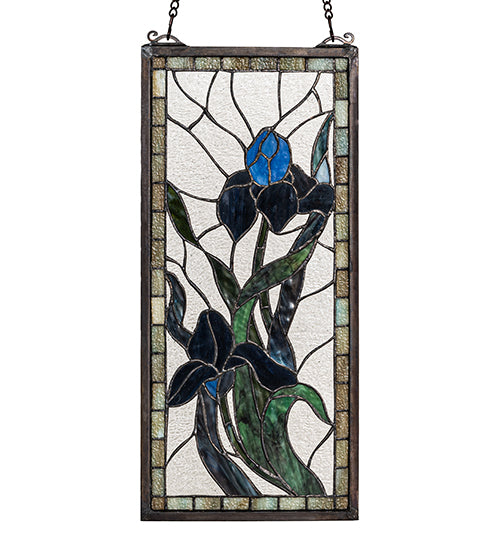 Meyda Tiffany's original Iris design celebrates the beauty of the flower named for Juno's messenger who was turned into a rainbow. Purple Iris flowers and Spring Green leaves adorn a Clear Frost background banded in Sky Blue. Handcrafted of 124 pieces of stained art glass utilizing the copperfoil construction process. Mounting bracket and jack chain included.