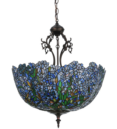 The cascading blossoms in hues of Azure, Lavender, Mauve, and Amber with Spring Green leaves made the Tiffany Laburnum a favorite subject of Tiffany Studios. This beautiful Laburnum art glass inverted shade is created with the famous Meyda Tiffany copperfoil construction technique. This ceiling pendant is ideal for entryways and dining spaces, illuminating fine homes, restaurants, and other spaces. The overall height of each element ranges from 28 to 63 inches as the chain easily adjusts on location to meet your specific lighting specifications. The Tiffany Laburnum Inverted Pendant is featured in our American-designed, handcrafted Tiffany Reproduction Collection. If you intend to utilize this product in a coastal or any other challenging damp location, please call us for a quote.