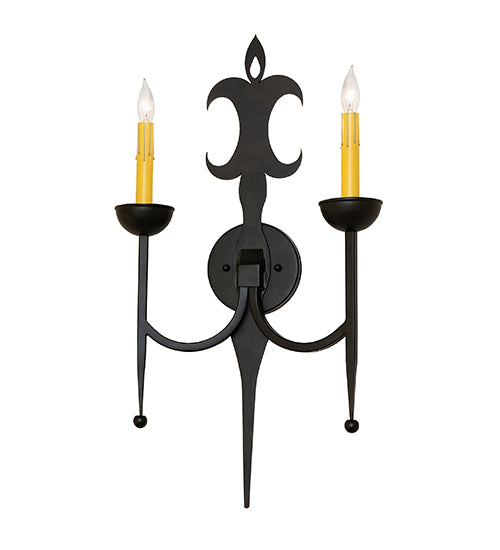 A rich, refined twist on a classic elegant lighting design. This exquisite wall sconce features a Blackwash finished frame with 2 Faux Amber candlelights perched on bobeches with ballpoint stems. A sumptuous fixture, topped with a distinctive Fleur-de-lis and inspired by the great chateaus of France, this fixture is handcrafted by highly skilled artisans in our manufacturing facility in Upstate New York, this exquisite sconce is available in a wide range of custom choices including various designs, colors, and sizes. If you intend to utilize this product in a coastal or any other challenging damp location, please call us for a quote.
