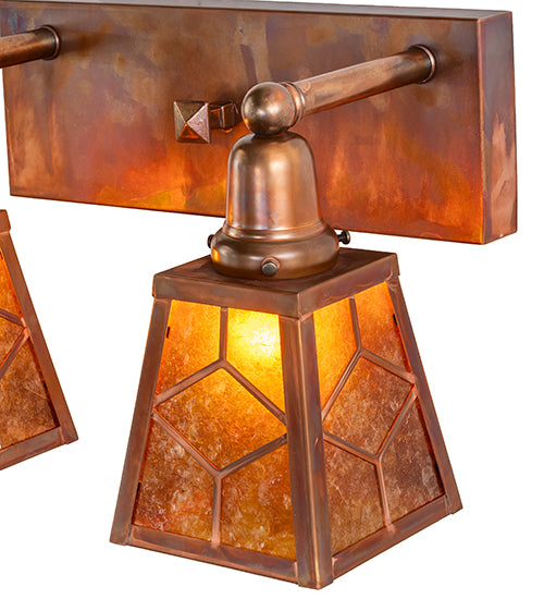 A handsome Mission styled wall sconce features a stunning Diamond pattern that glows with 2 Amber Mica shades. The shades are created in the same method of combining translucent mica with shellac utilized by Dirk Van Erp in 1910. This Mission style pendant features Vintage Copper hand finished Solid Brass frame and hardware. Handcrafted by highly skilled artisans in our 180,000 square foot manufacturing facility in Yorkville, New York. Custom colors, styles and sizes are available. Dimmable energy efficient lamping options offered.