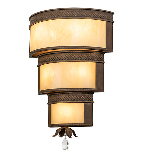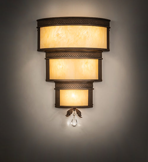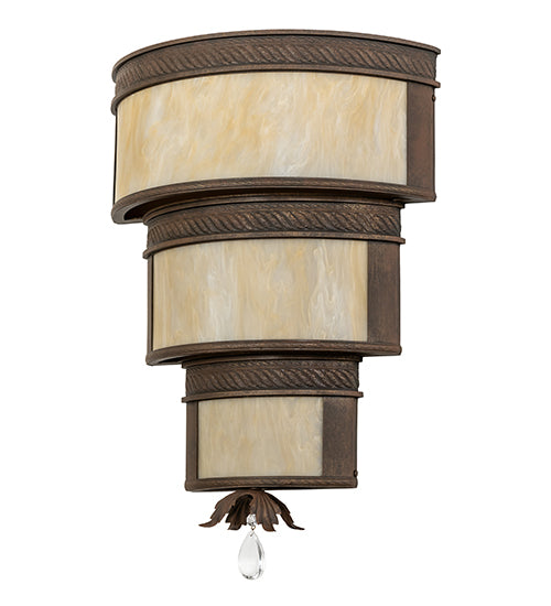 A luxurious 3-tiered wall sconce design reveals an elegant, distinguished architectural look which is accented with rope-like trim. Clean sophistication astounds with round surfaces to enhance the Sahara Taupe Idalight diffuser that is enhanced with Cortez Gold finished accents and hardware. The fixture is perfect illumination for corridors and other rooms in residential and commercial areas. Handcrafted by highly skilled artisans in the USA. This 18-inch wide sconce includes a Crystal Pendalog accent on the bottom. Custom options are available. If you intend to utilize this product in a coastal or any other challenging damp location, please call us for a quote.